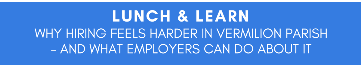 Across Vermilion Parish, employers are experiencing a tighter labor market, faster turnover, and shifting workforce expectations. This Lunch & Learn will provide clarity on what has changed — and what businesses can realistically do about it.